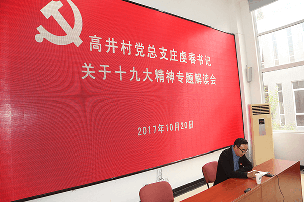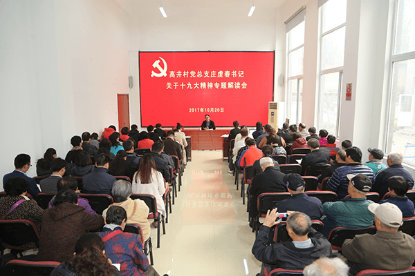 2017年10月20日上午,高井村党总支在南三村会议室召开了学习十九大精神专题解读会,高井村党总支庄虔春书记以讲党课的形式为全体党员解读了十九大会议精神,来自高井党总支14个党支部党员、入党积极分子及非公企业代表等80余人参与了此次会议,会议由高井村党总支副书记果屹娜主持。